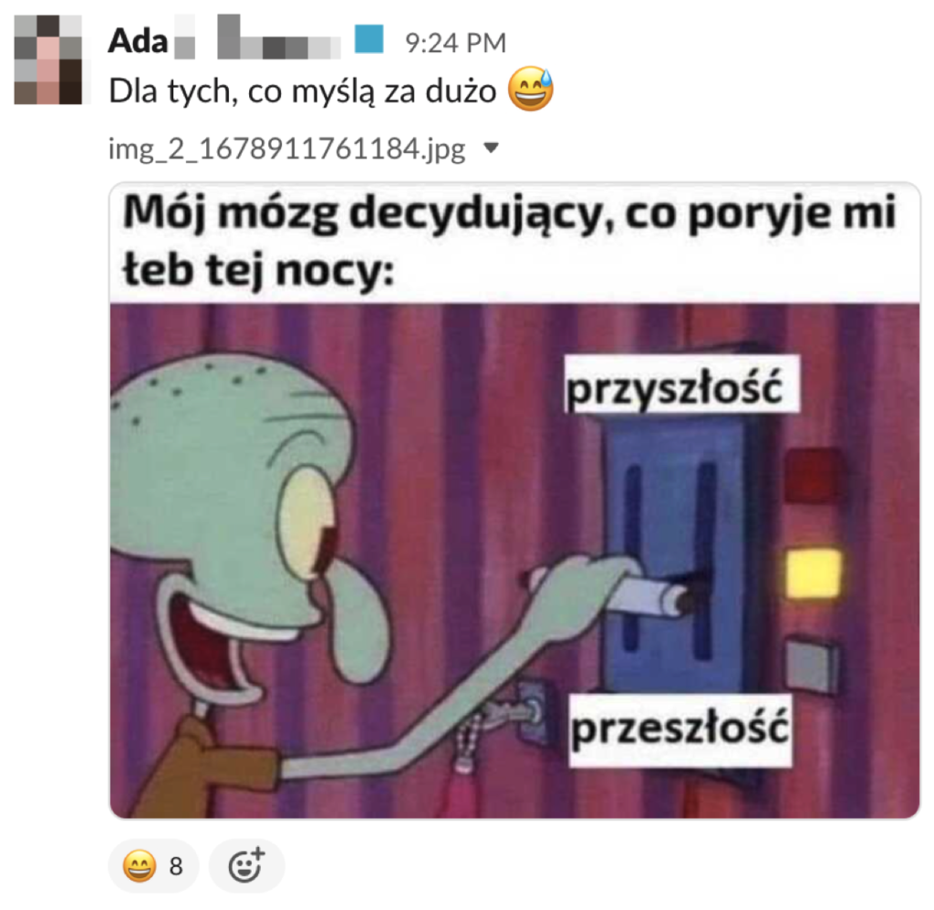 Zanurzmy się w świecie memów i na początku skoncentrujmy się na czymś, co wszyscy zrozumieją. Jeśli oglądacie na YouTube lub Spotify filmy wideo, pewnie widzieliście mem wrzucony przez Adę na jeden z firmowych komunikatorów wewnętrznych. Ten mem przedstawia postać z jakiejś kreskówki, prawdopodobnie Sponge Boba. Na memie postać stoi przed przełącznikiem, który symbolizuje przyszłość i przeszłość. Góra oznacza przyszłość, a dół przeszłość. Podpis na memie brzmi: „Mój mózg decyduje, co pokryje mi łeb tej nocy, czy przyszłość czy przeszłość”.