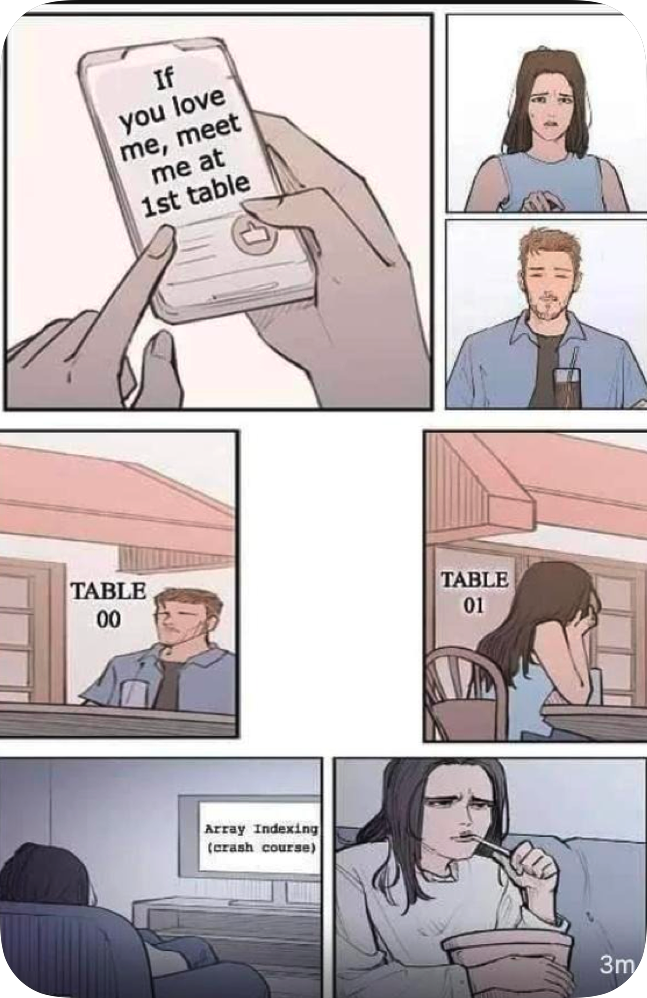 Można by powiedzieć, że to historia mężczyzny, który pisze do kobiety, albo kobiety, która pisze do mężczyzny. Mężczyzna pisze: „Jeśli mnie kochasz, spotkajmy się przy pierwszym stoliku”. Następnie siada przy stoliku numer 00, a kobieta siada przy stoliku numer 01. Nie spotykają się. Ich miłość nie ma szans na powodzenie. Kobieta wraca do domu i zaczyna uczyć się programowania. Jeśli jesteście z branży IT i kojarzycie ten mem, to wiecie, dlaczego mężczyzna usiadł przy stoliku 00, pomimo że pisał o pierwszym stoliku.