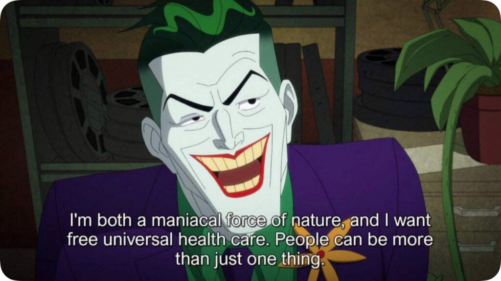 Idąc dalej, możemy budować ogromną, wręcz fascynującą narrację wokół memów, ponieważ świat IT zachęca do opisywania tego świata za pomocą dzieł popkultury. Ja mam taki jeden mem, który nawet nie jest małym. To jest kadr z animacji o Batmanie, jednej z wielu. Prawdopodobnie ten kadr reprezentuje największego przeciwnika Batmana, czyli Jokera. Jest to cytat, który wypowiada ta postać. Cytat brzmi następująco: „Jestem jednocześnie maniakalnym siłą natury i oczekuję powszechnej, darmowej służby zdrowia”. Ludzie mogą być czymś więcej niż tylko jedną rzeczą na raz. To są genialne słowa, które ja parafrazuję w następujący sposób: „Jesteśmy czymś więcej niż tylko wynikiem FRIS®”.