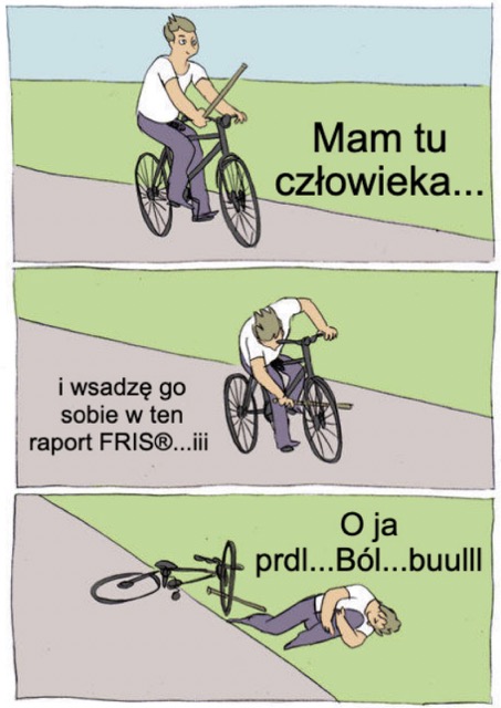 Patyk symbolizuje narzędzie FRIS, które możemy sobie sami włożyć w szprychy i przewrócić się na rowerze. Mam nadzieję, że udało mi się oddać istotę tego mema. Oczywiście, łatwiej to zobaczyć na obrazku. Warto pamiętać, że FRIS jest prosty, praktyczny i użyteczny, ale wymaga poprawnego wdrożenia i użytkowania w organizacji. Dlatego mamy tu człowieka jadącego na rowerze i trzymającego patyk, który reprezentuje pewne narzędzie. Używając narzędzia w niewłaściwy sposób „przewrócimy się”. Wtedy możemy mieć problem z otwartością i zaangażowaniem w zespole. Ludzie będą czuć się niekomfortowo z wdrożeniem narzędzia, co prowadzi do oporu przed kolejnymi tego rodzaju inicjatywami.